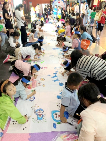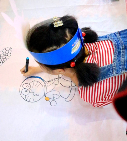 在影城售票大廳內(nèi),工作人員已經(jīng)準(zhǔn)備好了畫筆和一塊10米長(zhǎng)的畫布。在主持人的組織下,小朋友們分別圍繞在畫布四周,進(jìn)行繪畫創(chuàng)作,小朋友們十分專注、認(rèn)真,充分發(fā)揮自己的想象力。半小時(shí)后,一個(gè)個(gè)生動(dòng)活潑的“哆啦A夢(mèng)”繪畫作品呈現(xiàn)在畫布上,小朋友們的作品得到了陽(yáng)光畫室老師的大力肯定。